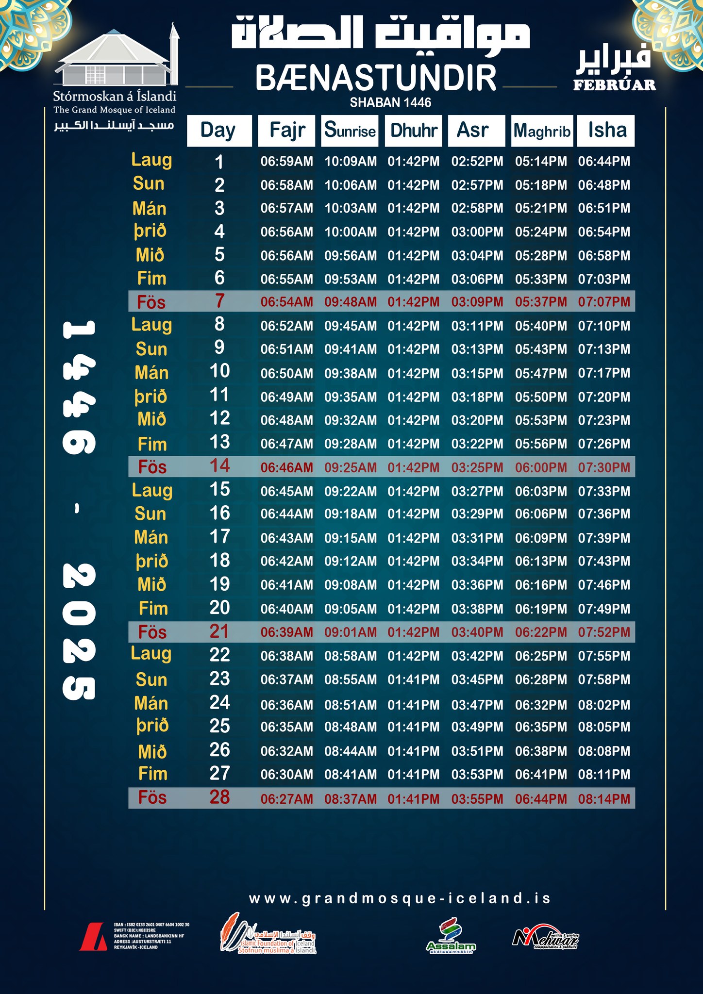 مواقيت الصلاة لشهر فبراير2025
